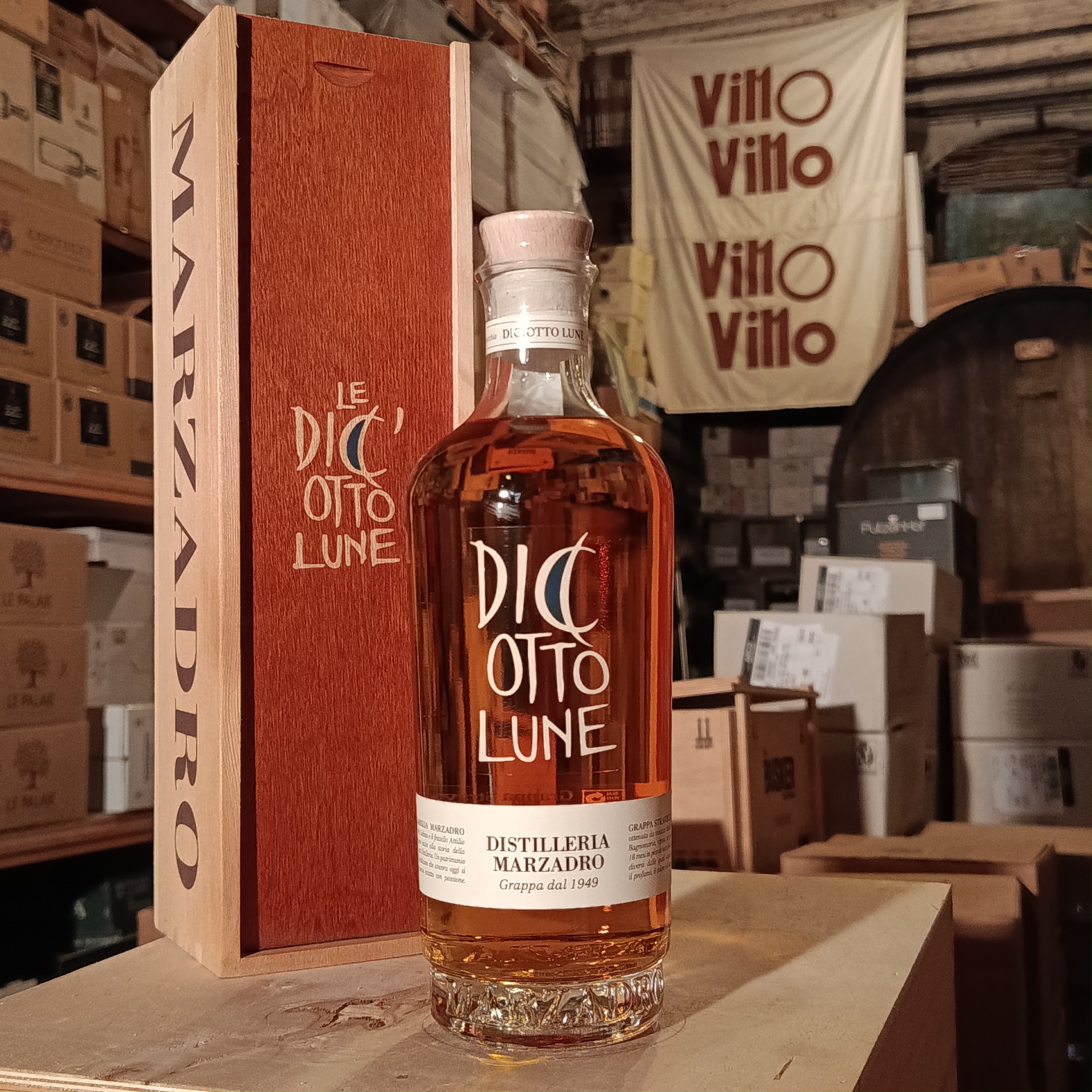 Il Mastro Distillatore ne segue la maturazione sino al raggiungimento del blend ideale e della piena armonia tra legno e Grappa. Nasce così, Le Diciotto Lune Marzadro, raffinata Grappa da meditazione.