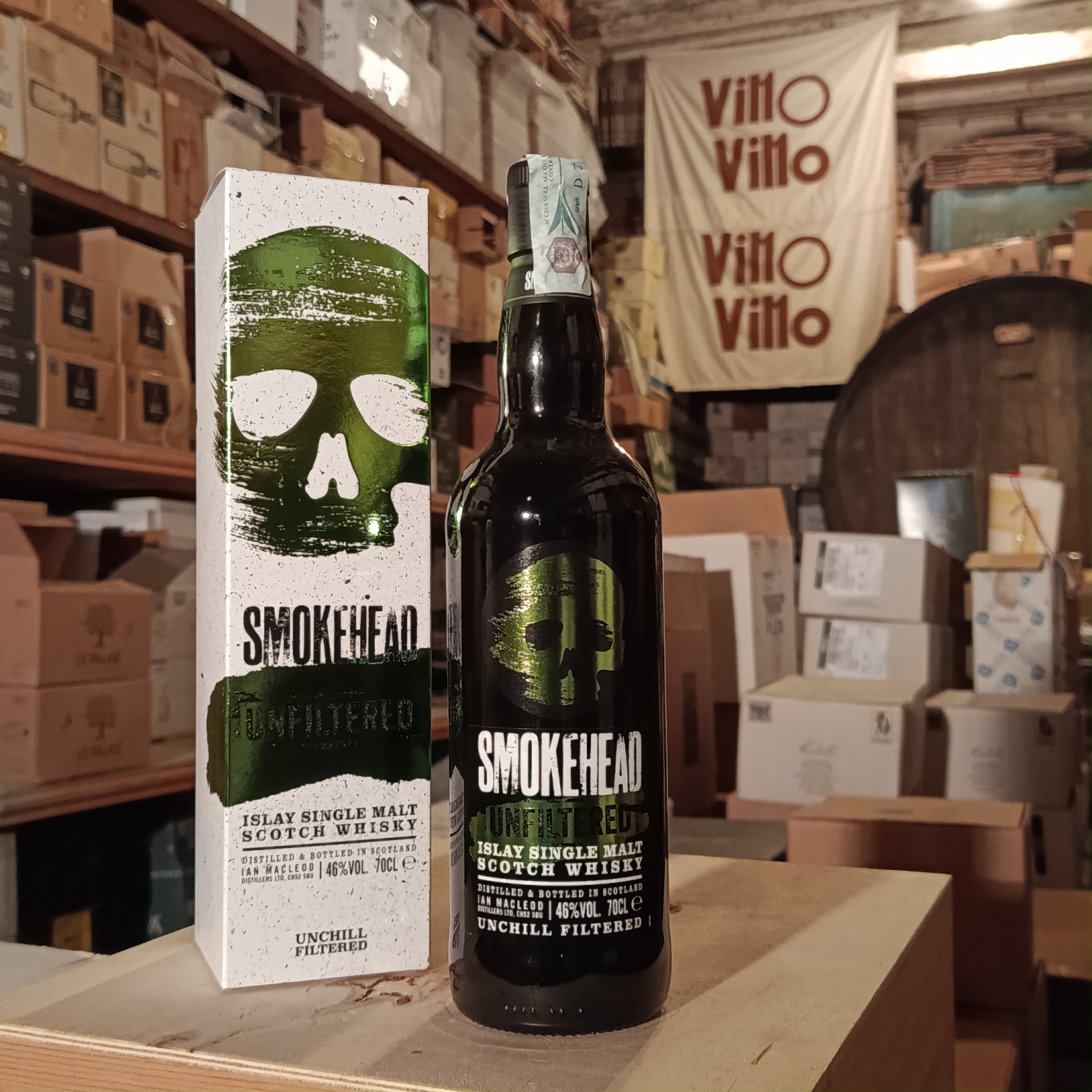 Lo Smokehead Unfiltered è un single malt Scotch whisky torbato invecchiato in un mix di botti di rovere prima di essere imbottigliato al 46% vol. senza essere filtrato a freddo